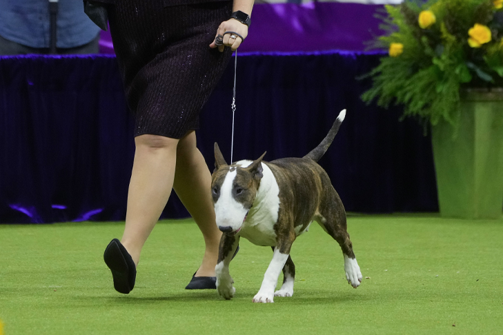 Colored Bull Terrier, “Frankie,” GCHB CH Grabo Frankie Goes To Magor, won the Terrier Group at Westminster. Frankie is owned by Sarah and Joe Byezewski.