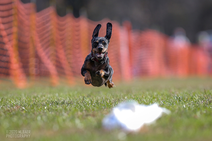 The next year, we were introduced to Fast CAT by our coursing friends, and Nugget was a rock star! He loved chasing the lure and his feet never seemed to hit the ground as he ran the 100-yard course. He finished 2nd nationally for Dachshunds that year. Since then, he has been the No. 1 Dachshund each year and the top Dachshund for lifetime with top times between 21.8 and 22.17 mph.