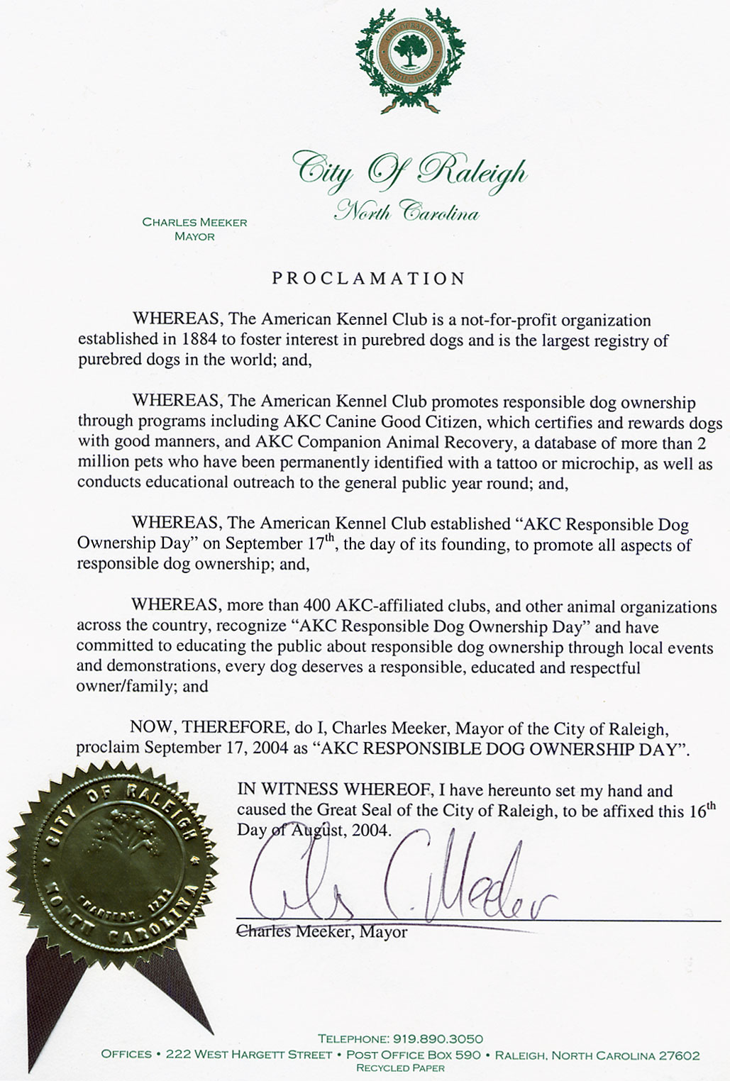 In recognition of the AKC’s Responsible Dog Ownership Day, Mayor Charles Meeker of Raleigh, North Carolina has proclaimed September 17, 2004 as “AKC Responsible Dog Ownership Day.” View the proclamation.